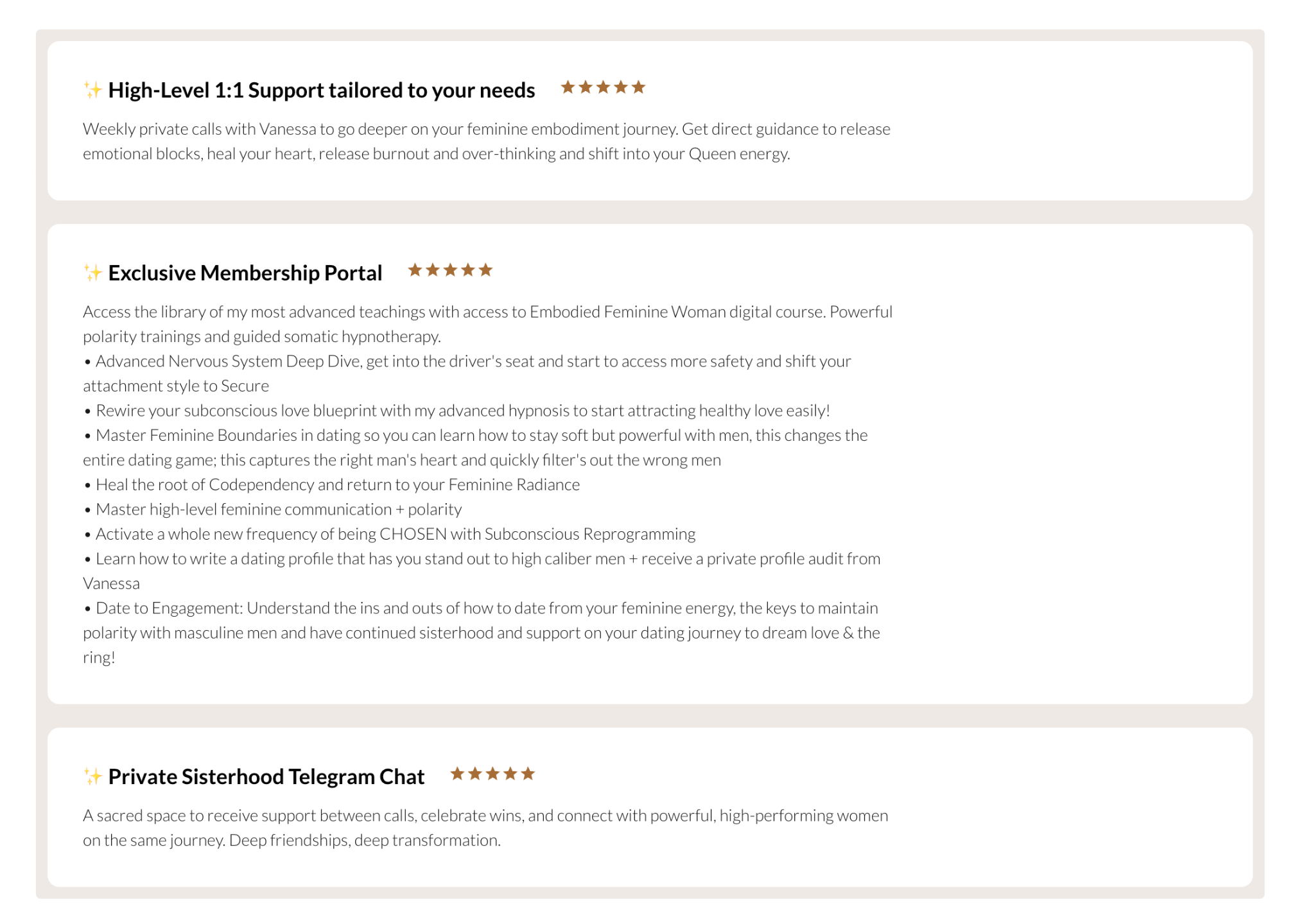 Most feminine energy courses will teach you that feminine embodiment means doing a womb healing session and dancing, while that might be fun (and maybe something to do to amplify your feminine once you've done real healing work), it's not going to shift the needle and get you tangible results in how you relate in your romantic relationships and the type of men you attract... Vanessa knows what real inner work looks like and takes because she has had to walk this path herself. She is the embodiment of what she teaches.